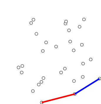 그래픽으로 들어가기에 앞서 원리를 한 줄로 설명해보자면, 모든 점이 “가장 바깥쪽에 있다”라는 것을 증명하기 위해서는 이어지는 세 점의 집합이 모두 “좌회전”하면 됩니다. 수학적으로 설명하는 것보다, 실제로 알고리즘이 어떤 식으로 작동하는지 한번 살펴보는게 이해가 훨씬 쉬울 것 같아요. 함께 보시죠.