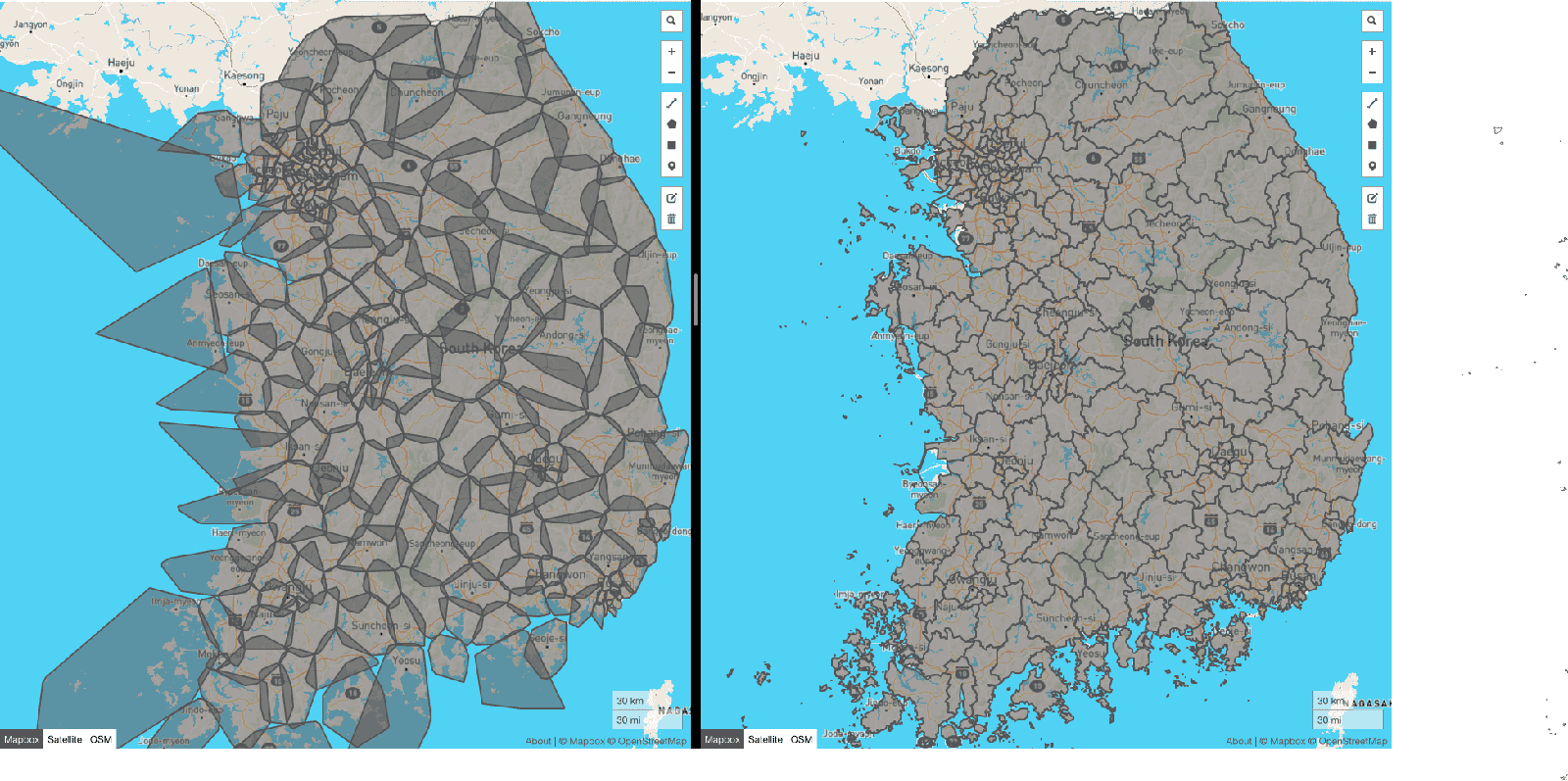 Fig 17. 좌: convex hull을 적용한 대한민국 지도. 우: 기존에 사용하던 대한민국 지도