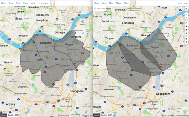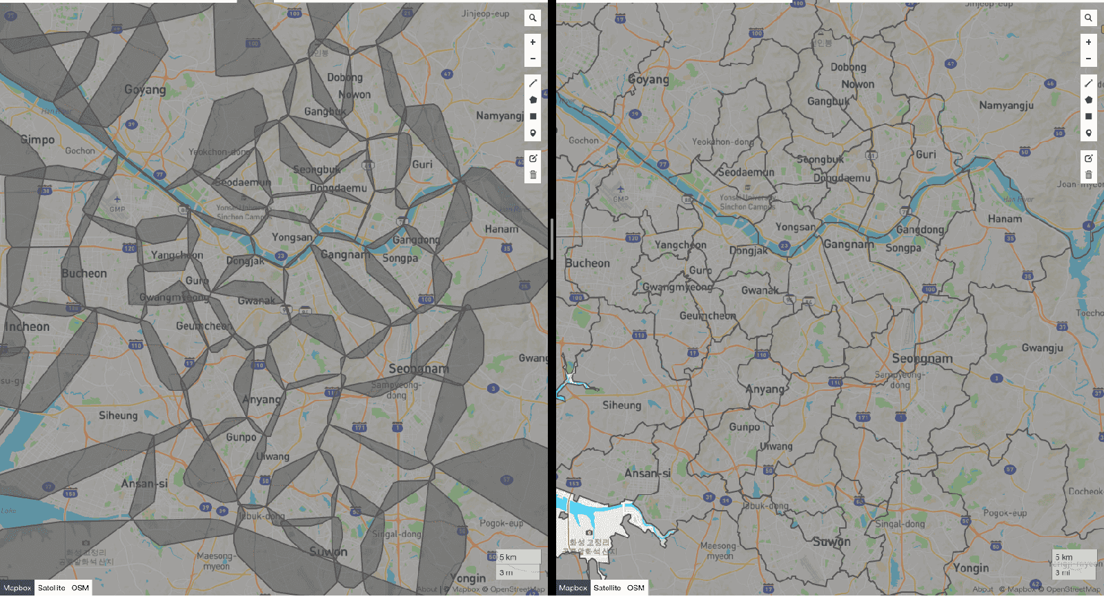 Fig 18. 좌: convex hull을 적용한 서울의 지도. 우: 기존에 사용하던 서울의 지도