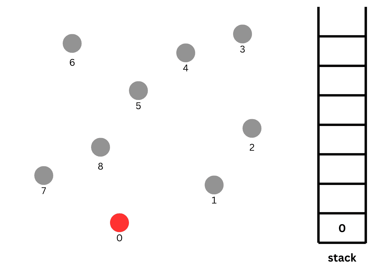 먼저, 한 점을 기준으로 잡고 반시계방향으로 모든 점을 넘버링합니다. 보통 기준점은 y축의 가장 밑에 위치한 점으로 잡습니다. 그리고 스택이 하나 필요합니다. 일단 시작으로 기준점을 스택에 넣습니다.