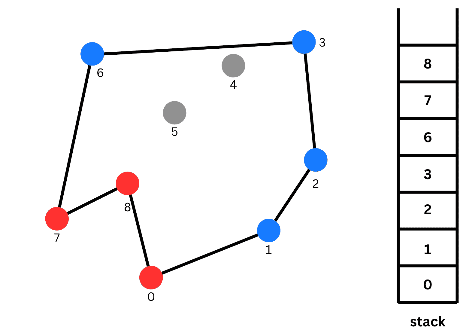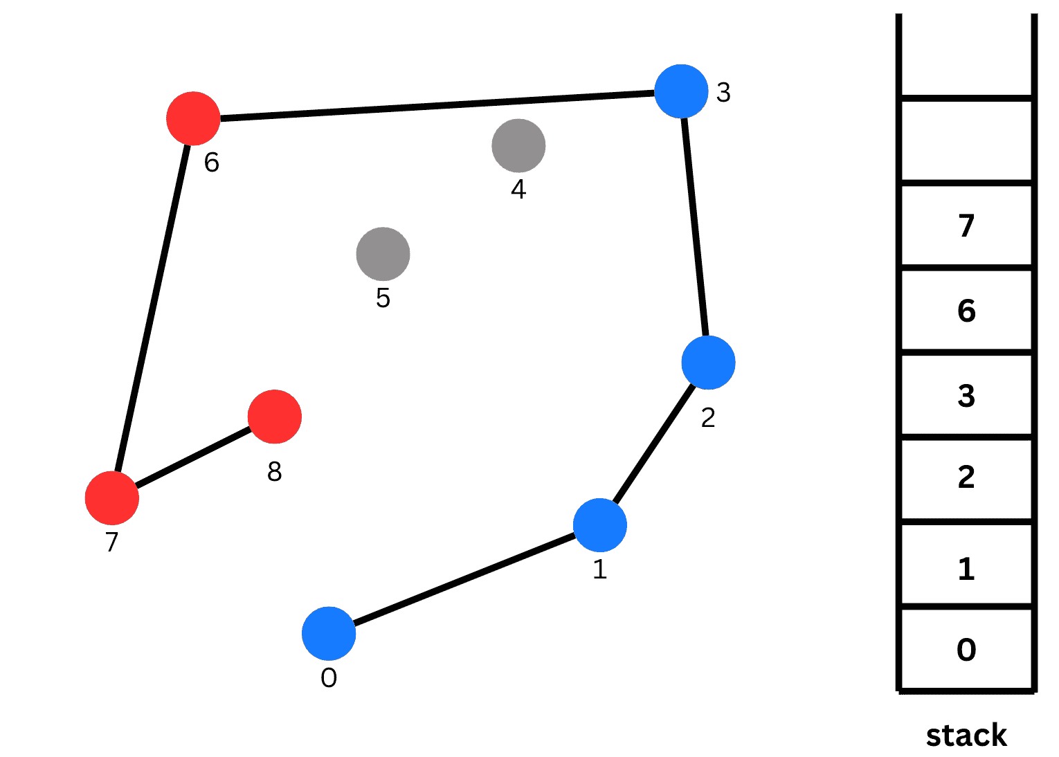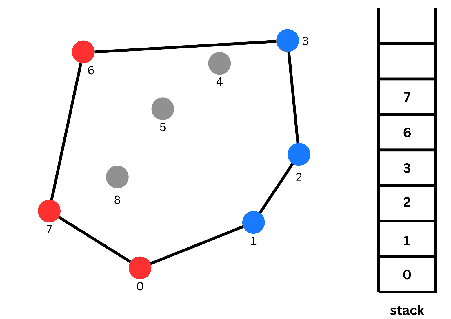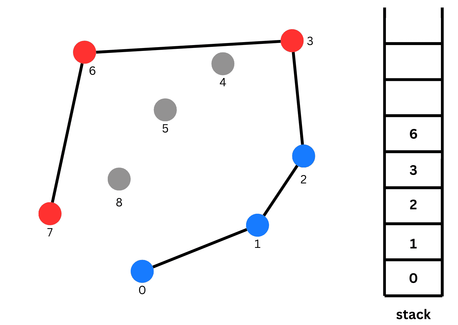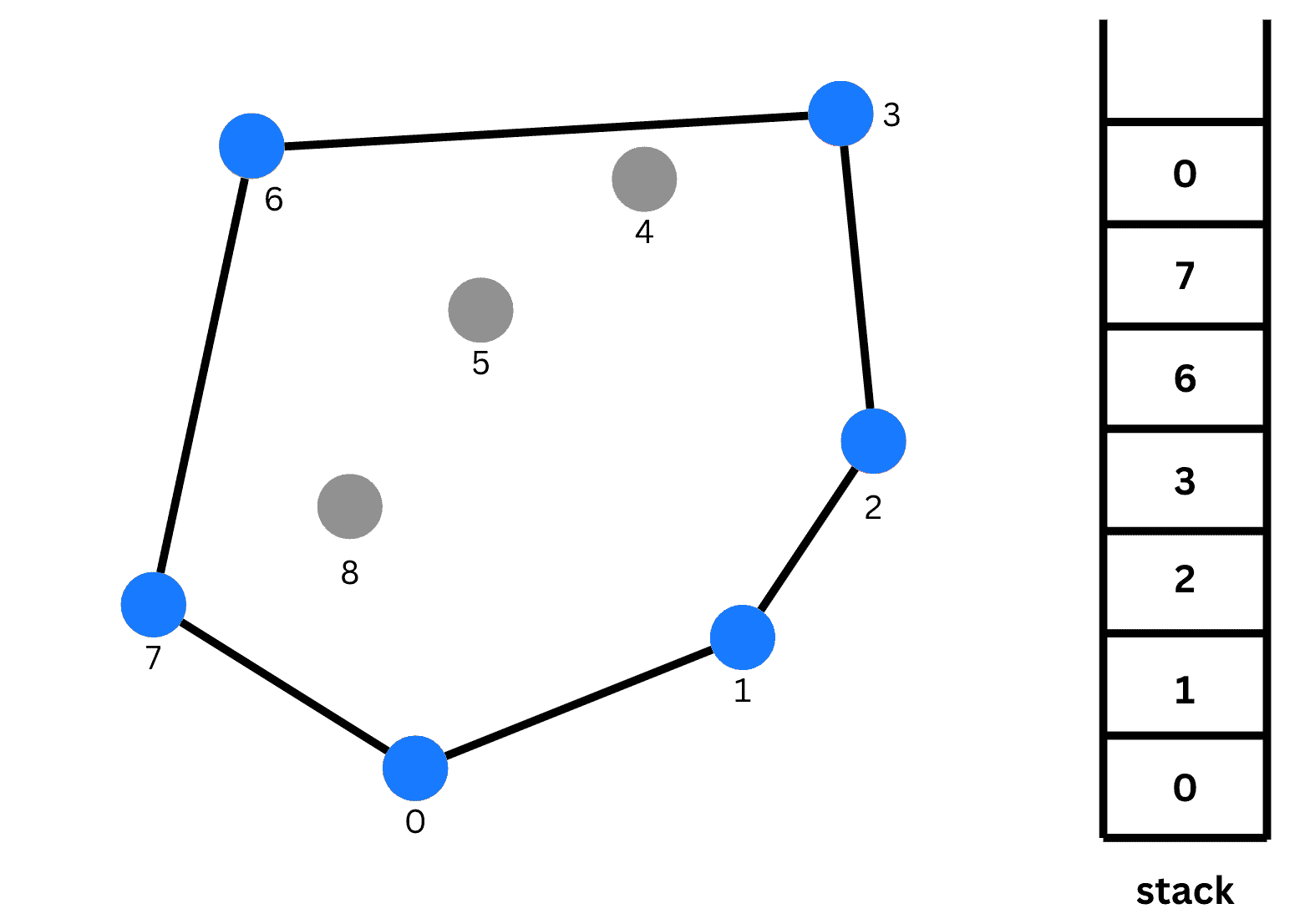 이렇게 모든 점을 다 판별하고 시작점으로 돌아왔을 때 알고리즘은 종료가 됩니다. 그리고 원하던 외접다각형의 점들의 집합 [0, 1, 2, 3, 6, 7]이 완성이 되었네요.