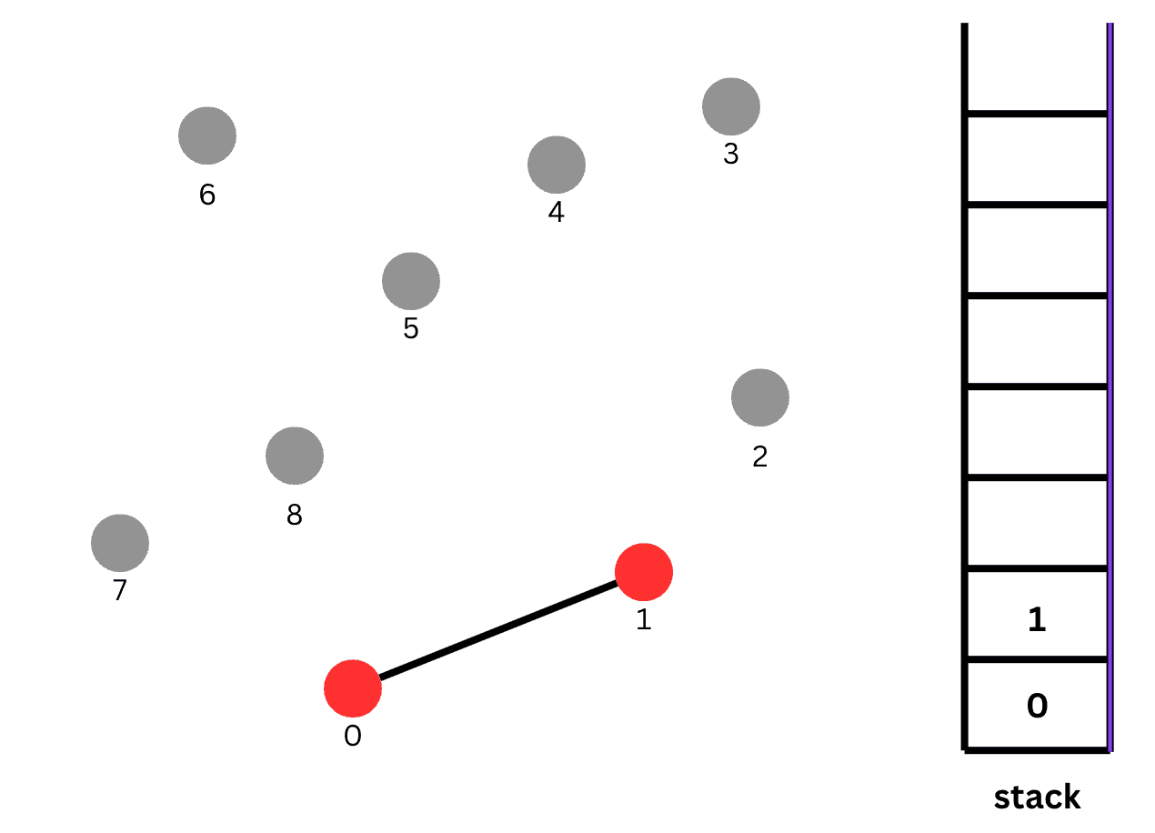 그 후, 1번 점을 스택에 넣습니다. 그리고 0에서 1로 이어지는 선을 그어줍니다.