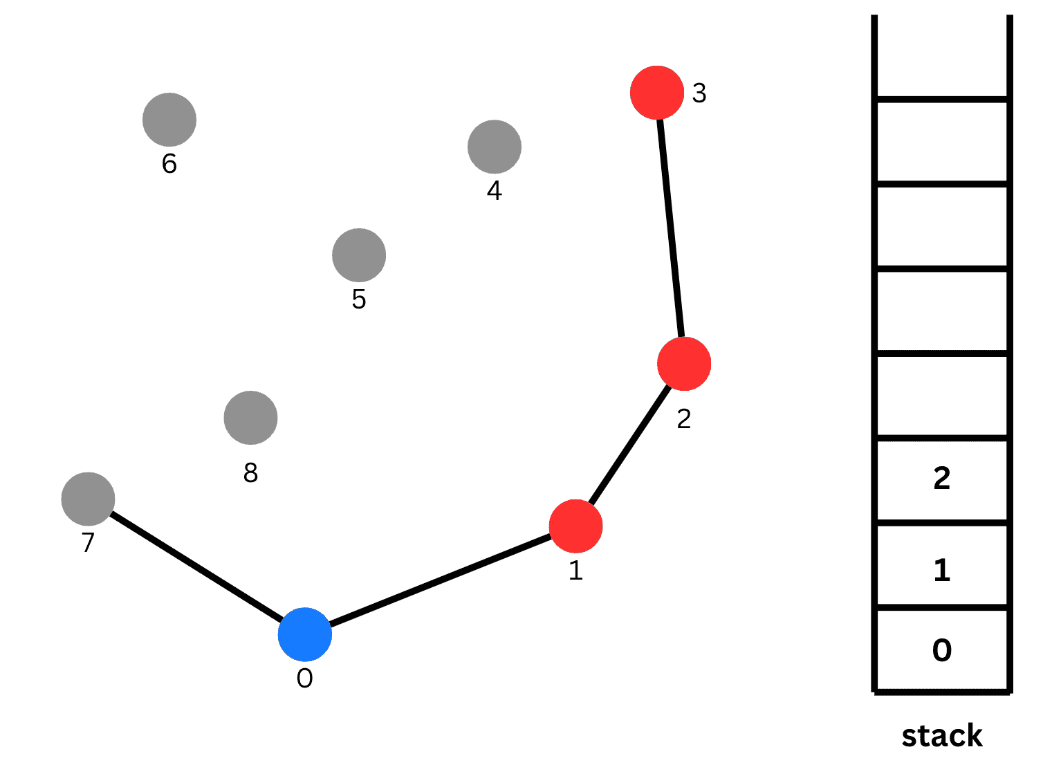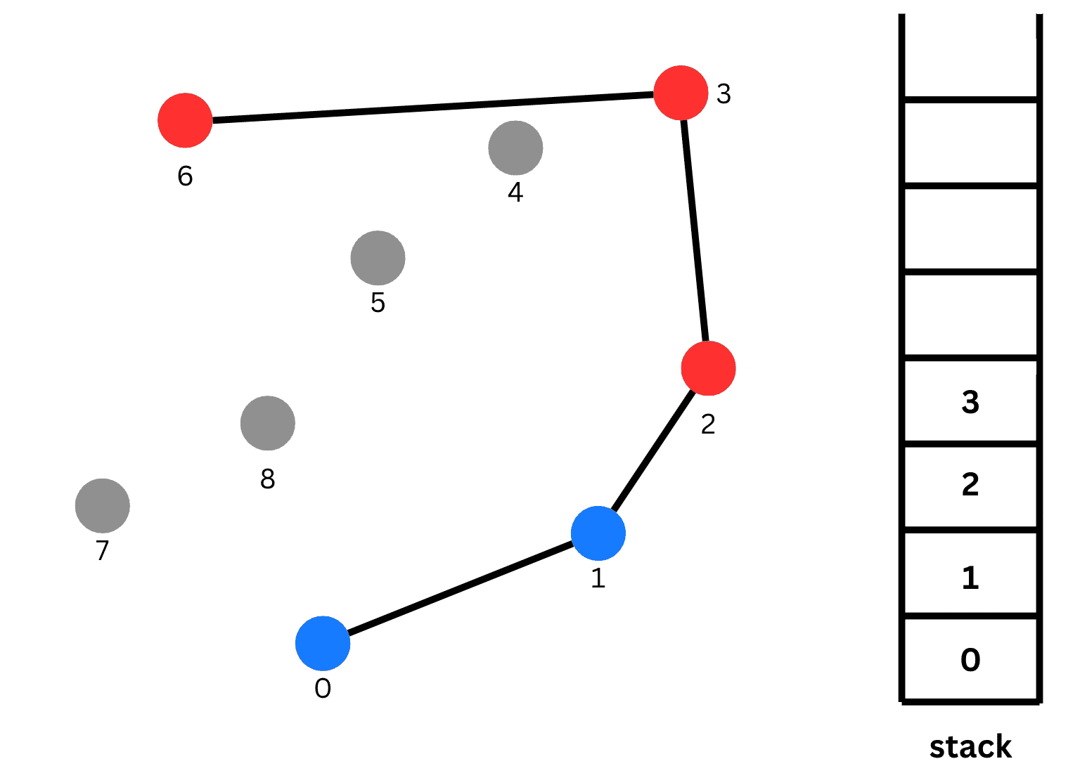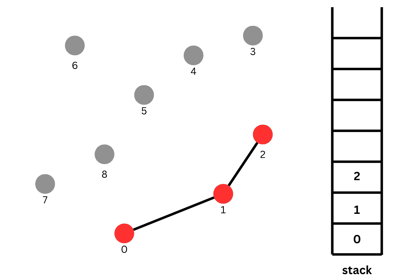 0에서 1로 이어지는 직선을 A, 1에서 2로 이어지는 직선을 B라고 할 때, A에서 B로 가는 것이 “좌회전”을 한다면 해당 점들은 외접다각형의 일부라고 볼 수 있습니다. 0,1 그리고 2는 모두 저희가 찾는 외접다각형의 일부네요. 그렇다면 2를 스택에 넣고, 1->2와 2->3의 비교로 넘어갑니다.