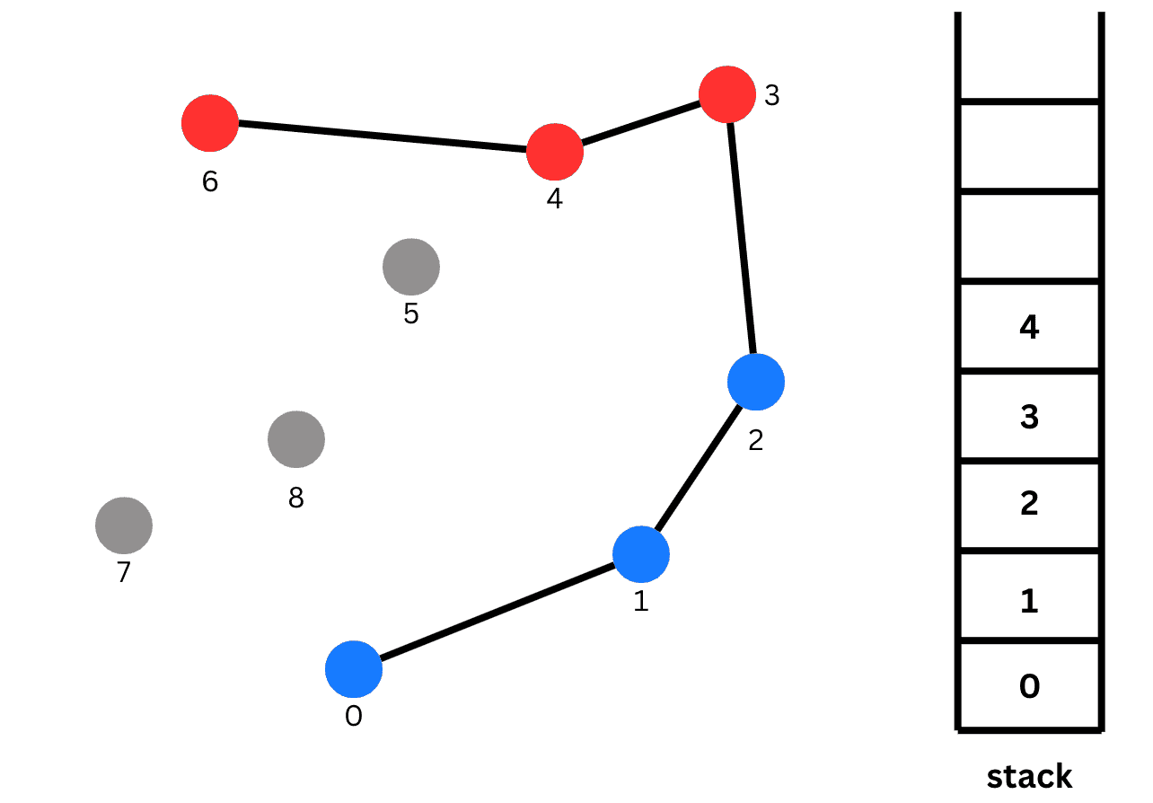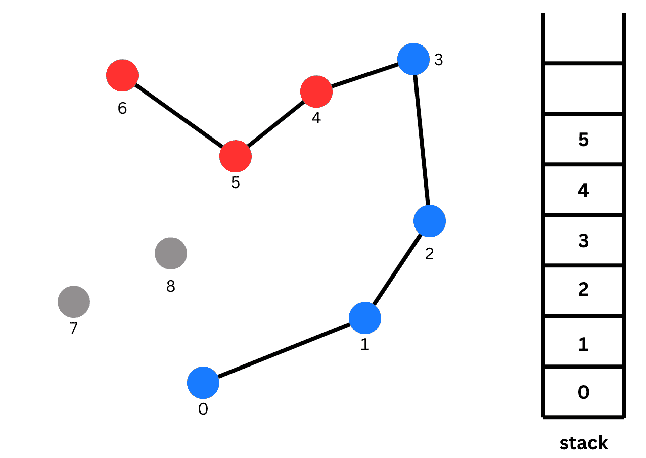 스택에는 이미 5까지 들어가 있고, 6에 대해 판별을 할 차례입니다. 그러나 4→5의 직선과 5→6의 직선을 비교했을 때 각도가 바깥쪽으로 향하므로 우회전을 하네요. 그렇다는 것은 스택의 맨 위에 존재하는 5가 우리가 찾는 외접다각형의 일부가 아니라는 뜻입니다. 그러므로 5를 스택에서 빼줘야 합니다.