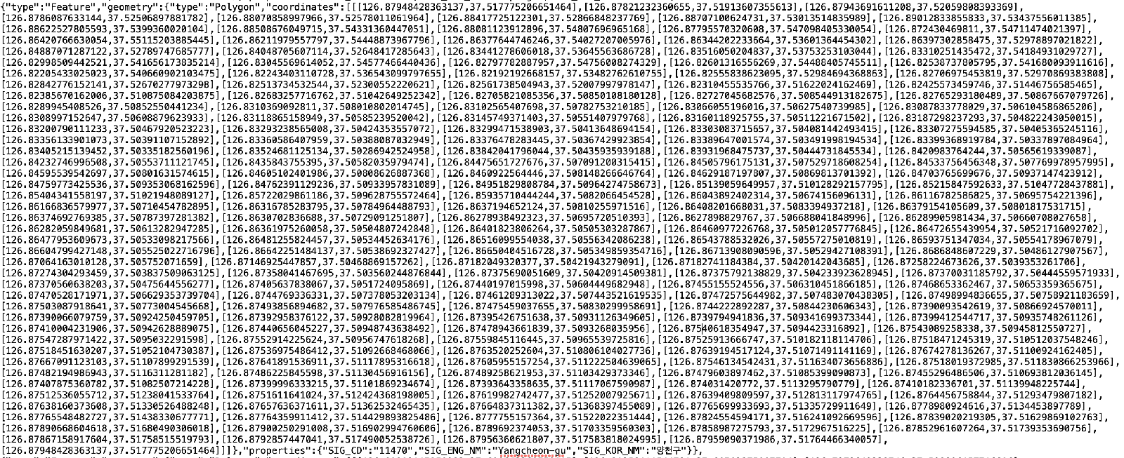좌표 하나에 40바이트가 조금 안되는데, 주먹구구식으로 양천구만 계산해봐도 8천바이트가 나오네요. 양천구보다 데이터가 큰 지역도 많았기에, 1mb로 250개 지역을 모두 선택하기엔 부족한 수치라고 결론지을 수 있었습니다.