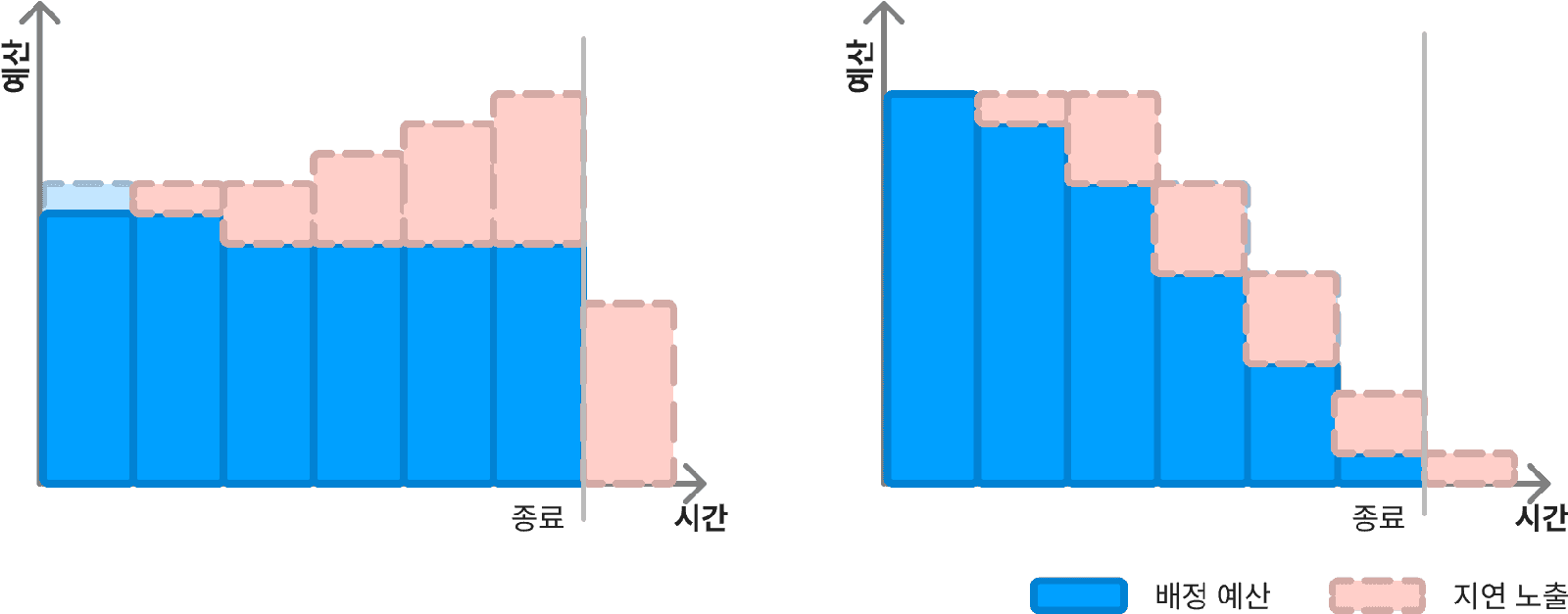 만약 제어 평가 주기를 충분히 줄였으나 1시간당 10만 원의 지출 계획을 세우면 어떤 문제가 생길 수 있을까요? 아마 가장 큰 문제는 10분 만에 10만 원을 모두 지출해버리고 50분 동안 광고가 송출되지 않는 것입니다. 이는 지속적으로 광고가 노출되지 않는 그 자체로 문제가 될 수 있고 초반 지출에 의해 기회가 많은 시간에 예산을 못쓰게 되어 성과 최적화에도 영향을 줍니다.