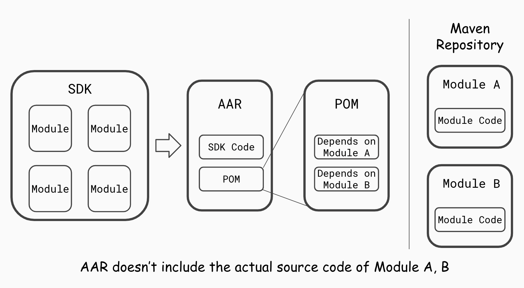 SDK의 결과물인 AAR 파일에는 참조하는 모듈의 코드가 포함되지 않는다. 따라서 SDK 배포 시에는 참조하고 있는 모든 모듈이 배포되어야 한다.