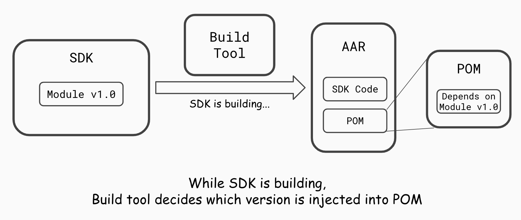 POM 파일에 참조하고 있는 모듈이 어떤 것인지 정해지는 것은 배포할 AAR 파일을 빌드하는 시점이다. 일반적으로는 빈트레이 업로드를 할 때 SDK가 빌드되며 버전 정보가 정해진다. 즉, 이 시점에는 모든 참조 모듈들의 버전이 정확히 관리되어야 한다. 만약 1.0.0으로 미리 배포된 후 코드 수정이 있었지만 아직 모듈의 버전 정보가 1.0.0으로 되어 있다면 AAR 파일에는 해당 모듈이 1.0.0으로 기록될 것이고, SDK 사용자는 의도하지 않은 버전의 모듈을 참조하게 될 것이다.