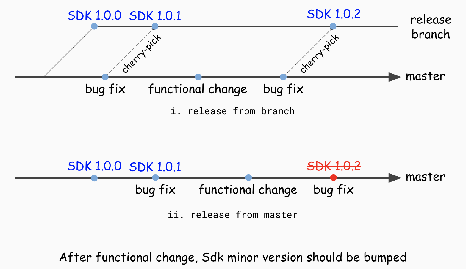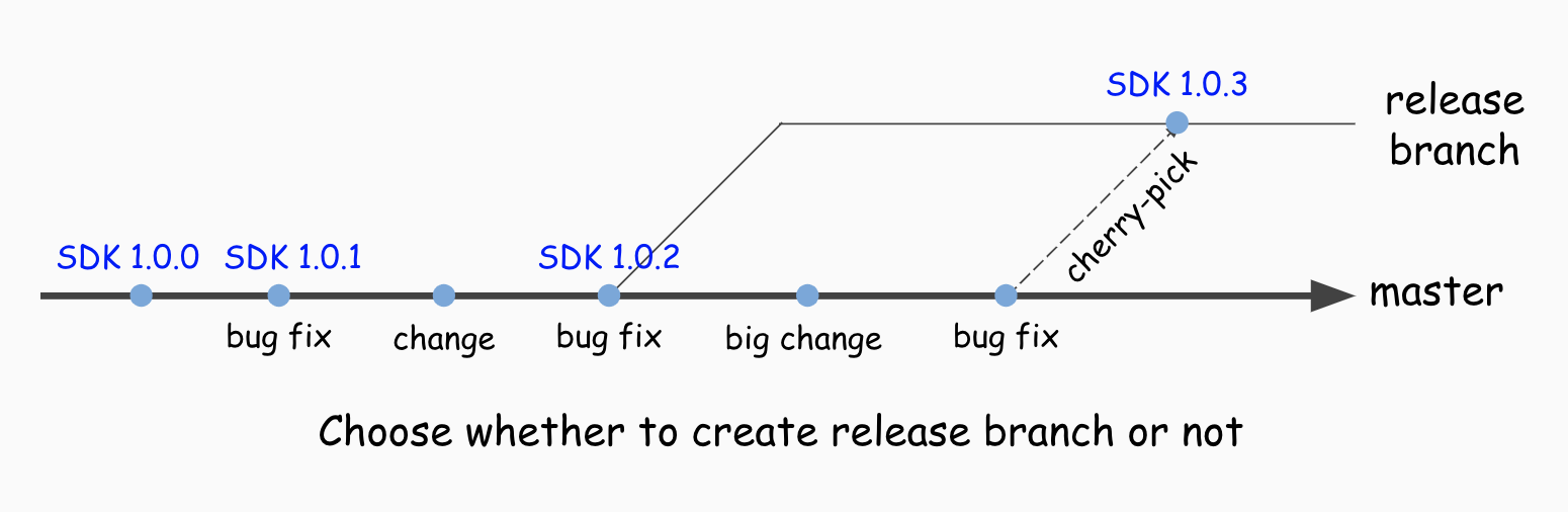 위와 같이 마스터에서 배포를 수행하는 도중에 기능 변화가 적용된 커밋이 있다면, SDK의 마이너 버전이 증가한 것이기 때문에 패치 버전의 증가만으로는 배포를 수행할 수 없다. 하지만 이를 해결하기 위해 위와 같이 모든 경우에 배포 브랜치를 생성하여 체리픽으로 관리를 하게 되면, 배포 시스템이 너무 복잡해지기 때문에 버즈빌에서는 다음과 같은 규칙으로 배포를 진행한다.